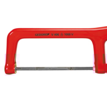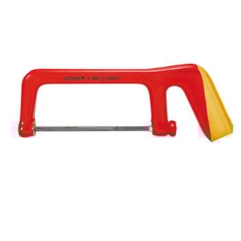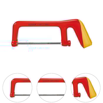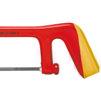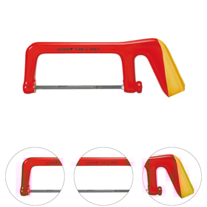 Aço especial e polímero anti-chamas. Cabo revestido produzido por imersão, propicia isolação até 1000 V, submetido e ensaio de tensão elétrica. Possui serra com comprimento de 148 mm, indicada para cortar metais. Atende com segurança a norma regulamentadora NR 10 - Segurança em Instalações e Serviços em Eletricidade, possui certificado de isolação. A Lâmina avulsa ref. 406 A, é comercializada para reposição.