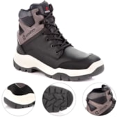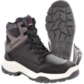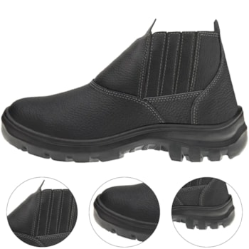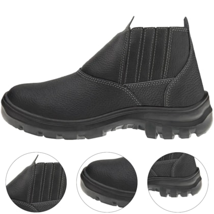 Calçado ocupacional, tipo bota até o tornozelo, modelo botina, constituída de couro, desenho do cabedal tipo (B), fechamento em elástico. Sistema strobel com palmilha de montagem em não tecido e injeção direta do soldado no cabedal. Região do solado totalmente fechado, com resistência ao escorregamento, solado bidensidade. Com forração lateral em material tecido sintético, foração da gáspea em não tecido, forração do dorso em material tecido sintético. Possui palmilha de montagem em Nonwoven (sintético de 2 mm de espessura). Solado de poliuretano constituído de injeção direta ao cabedal, bidensidade. Fechamento com elástico lateral, constituído com cabos de nylon e elastano.
