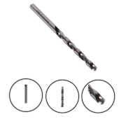 Broca com haste paralela, diâmetro 2.6mm com um comprimento total de 57mm e comprimento útil de 30mm de acordo com padrão DIN 338 com ponta com afiação em cruz 135°, feita em HSS com acabamento revenido à vapor e hélice rápida para furação sem guia 4xD em aço inoxidável.