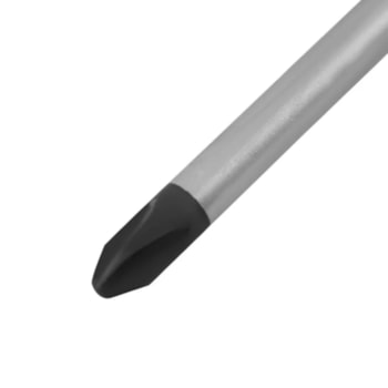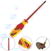 Haste em aço Gedore-Vanadium e cabo em polímero na cor azul padrão Gedore. Haste com acabamento niquelado e cromado, com ponta escurecida. Cabo ergonômico. Chave com haste redonda e resistente, com perfil de encaixe para parafusos tipo fenda cruzada “Phillips”.