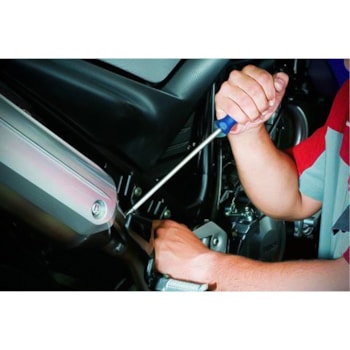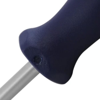 Haste em aço Gedore-Vanadium e cabo em polímero na cor azul padrão Gedore. Haste com acabamento niquelado e cromado, com ponta escurecida. Cabo ergonômico. Chave com haste redonda e resistente, com perfil de encaixe para parafusos tipo fenda cruzada “Phillips”.