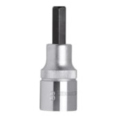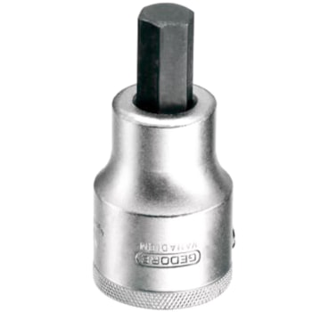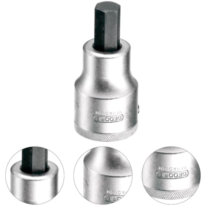 Aço Gedore-Vanadium. Soquete com acabamento niquelado e cromado/ zincado, com ponteira escurecida. Para trabalhar com acessórios manuais com encaixe quadrado 12,7 mm (1/2”), conforme DIN 3120 - C 12.5, ISO 1174. Indicada para parafusos com perfil de encaixe sextavado interno.