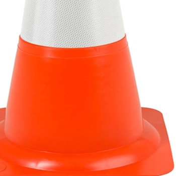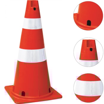 Cone semi flexível para sinalização e segurança laranja, com injetado em PVC. Possui duas faixas refletivas nas cores branca, com retrorrefletância de 250 candelas soldadas eletronicamente no cone. As faixas são confeccionadas em PVC prismático com espessura de 0,25mm e com forro de PVC com espessura de 0,2 mm.