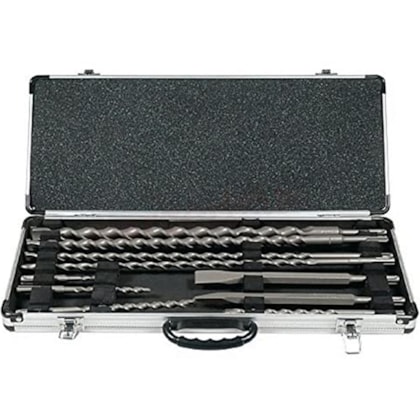 Jogo com 10 acessórios para martelete SDS-PLUS Makita, para uso em todos os marteletes e furadeiras que utilizem brocas SDS Plus. 8 brocas, 1 ponteiro, 1 talhadeira e uma maleta em alumínio.