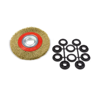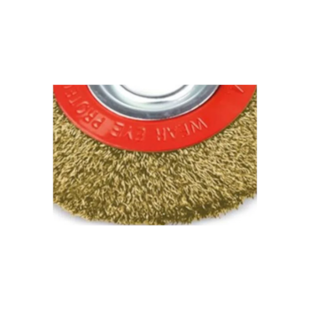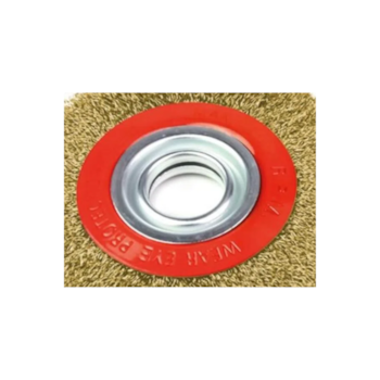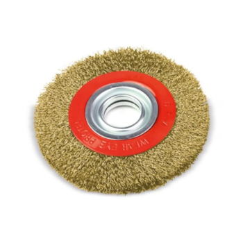 Escova de Aço Circular Latonada para aplicações em metais em geral. Acompanham buchas plásticas de redução: ½” - 5/8” - ¾” - 7/8” – 1”.