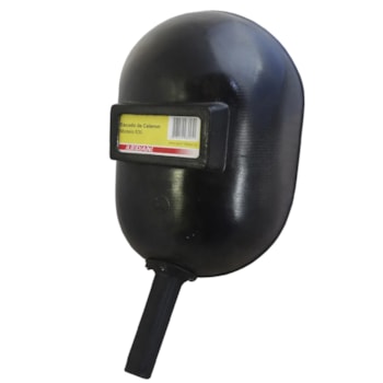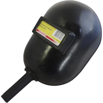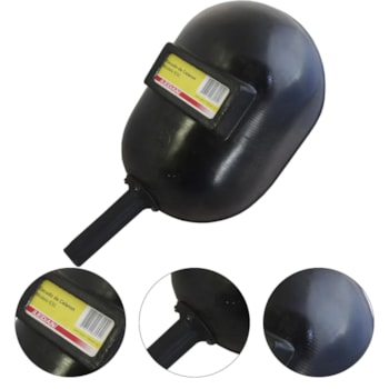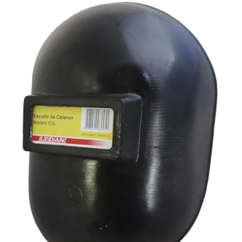 Escudo de solda com o casco confeccionado em Celeron preto, visor fixo em polímero, no qual em sua estrutura interna são montados a placa incolor de cobertura, uma guarnição de vedação, um filtro de luz e mola de segurança, sendo que a montagem e fixação dessas peças são guarantidas através da mola de segurança encaixada em fendas internas do casco, cabo de suporte confeccionado em polipropileno de aproximadamente 105 mm de comprimento e 25 mm de diâmetro, fixado ao casco através de três rebites de alumínio.