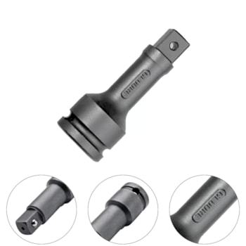 Aço-liga de alta resistência mecânica. Acabamento escurecido, ref. KB 1990-3" com acabamento fosfatizado. Para soquetes de impacto com encaixe quadrado 12,7 mm (1/2”), conforme DIN 3121, ISO 1174. Possui alojamento para utilização de pino e anel de segurança, a serem adquiridos à parte.