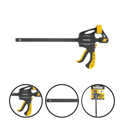 Produzido em plástico rígido ABS de alta resistência. Possui sistema de aperto rápido, proporcionando praticidade na aplicação. Ideal para fixar peças em processos de colagem, fixação, montagem de móveis, carpintaria, entre outros. Não utilizar para sustentação
