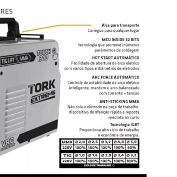 Tecnologia IGBT, potente corrente de solda e baixo consumo de energia elétrica.