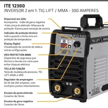 Função TIG-LIFT (Possibilita a solda de chapas finas e proporciona melhor acabamento final) tocha não inclusa