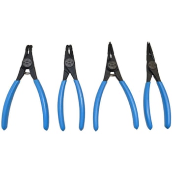 Tipos de alicates: 1 alicate para anéis, uso externo, pontas retas / 1 alicate para anéis, uso externo, pontas curvas 90º / 1 alicate para anéis, uso interno, pontas retas / 1 alicate para anéis, uso interno, pontas curvas 90º