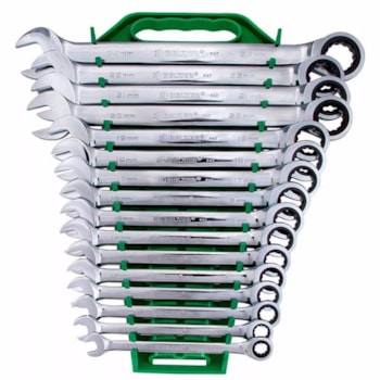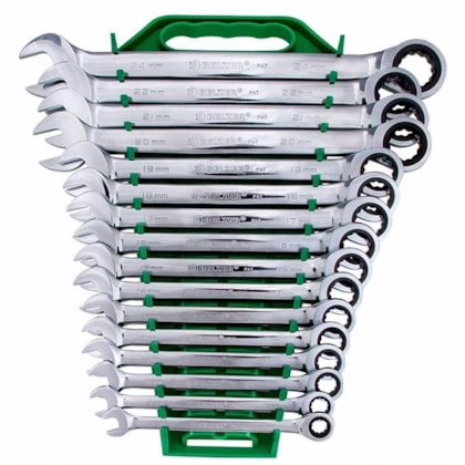 - 16 Peças compõem o kit, sendo de medidas: (8, 9, 10, 11, 12, 13, 14, 15, 16, 17, 18, 19, 20, 21, 22 e 24 mm);