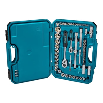 Este conjunto inclui várias catracas, chaves de fenda, chaves combinadas, um conjunto de chaves Allen e várias extensões e adaptadores.