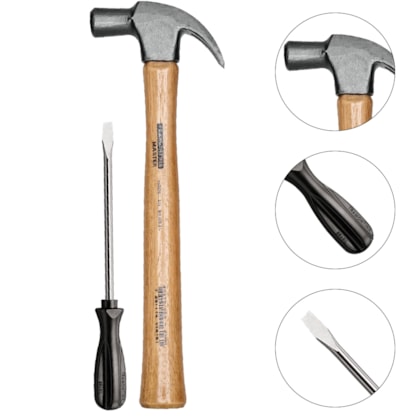 Martelo: toda obra precisa de um martelo de unha na hora de introduzir ou remover pregos, rasgar e remover componentes estruturais de madeiras. Toda a qualidade que você precisa para bater o martelo!