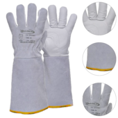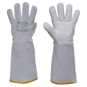 Luva de segurança confeccionada em raspa, com reforço palmar interno, com elástico embutido no dorso, costurada com linha de nylon, punho 15 e 20 cm. Aprovado para proteção das mãos do usuário contra agentes abrasivos, escoriantes, cortantes e perfurantes.