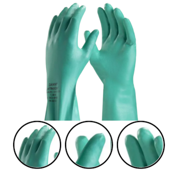 A luva Nitrasolv é confeccionada em borracha nitrílica e oferece proteção no manuseio de produtos químicos