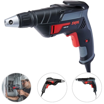 Com clip de cinto para facilitar o manuseio em lugares de difícil acesso, a Parafusadeira Skil Drywall 6520 conta com botão trava para trabalhos contínuos, engrenagens helicoidais para reduzir o ruído e função reversível. Embreagem de desconexão automática e controle de velocidade eletrônico até 4500 rpm garantem a qualidade do parafusamento, confira!