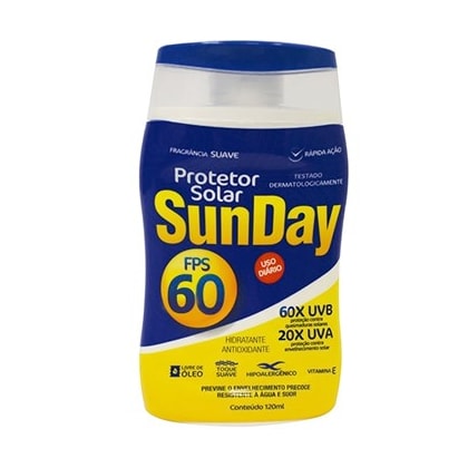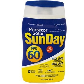 O Protetor Solar Sunday FPS 60, oferece alta proteção a pele contra os efeitos nocivos da radiação solar (UVA e UVB), ajudando a prevenir as queimaduras solares. Contém vitamina E, poderoso antioxidante que previne o envelhecimento precoce e extrato de aloe vera, que possui propriedades suavizante, hidratante e refrescante. Alem disso, minimiza os danos na pele causados pelos raios infravermelhos devido a ação antioxidante do produto.