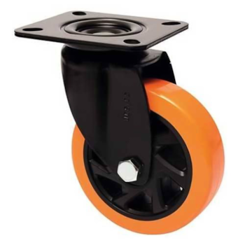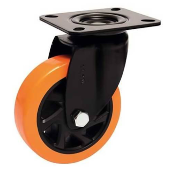 Roda: Banda em poliuretano (amarelo), sobre núcleo de polipropileno (preto), com duplo rolamento de esferas de precisão RLS4-2RS e bucha separadora M10. Dureza: 95 Shore A (-20ºC A 70ºC).