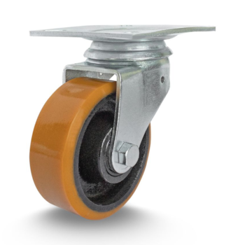 Roda: Banda em poliuretano moldado (amarelo), sobre núcleo de ferro fundido (preto) com duplo rolamento de esferas de precisão. Dureza 95 Shore A (-40°C a 80°C).
