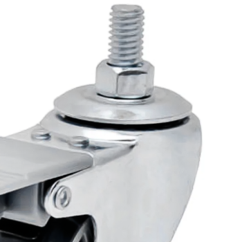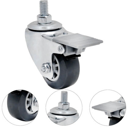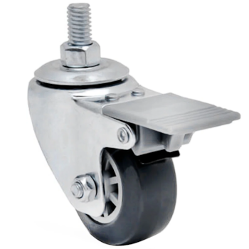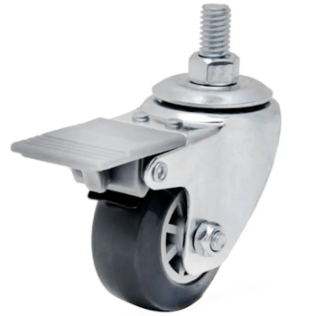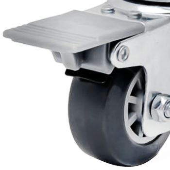 Roda: Banda em resina termoplástica PVC (cinza) e núcleo em polipropileno (cinza), furo passante.