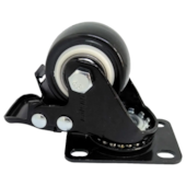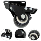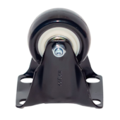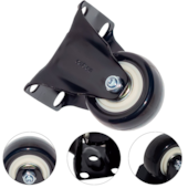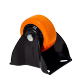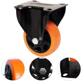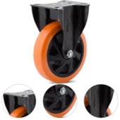 Roda: Banda em poliuretano (amarelo), sobre núcleo de polipropileno (preto), com duplo rolamento de esferas de precisão RLS4-2RS e bucha separadora M10. Dureza: 95 Shore A (-20ºC A 70ºC).